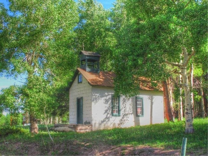 Tourists once flocked to Uptop, Colorado to ride on the railway, which the railroad company advertised as the “Railroad Above the Clouds.”  Later, lumber companies moved in and in 1930 the Chapel-by-the-Wayside was built for that community.  The railroad brought many tourists through La Veta Pass to Uptop which was a depot at the top of the pass and what was then the highest railroad and depot in the world.  With the building of the depot, merchants moved to the location to cater to rail passengers and for entertainment, they built a large dance-hall saloon. It was a favorite stop for miners, railroad men and lumberjacks. The bar, known for its unique curved bar, served prohibition liquor made in a still behind the building that fueled many a raucous poker game.